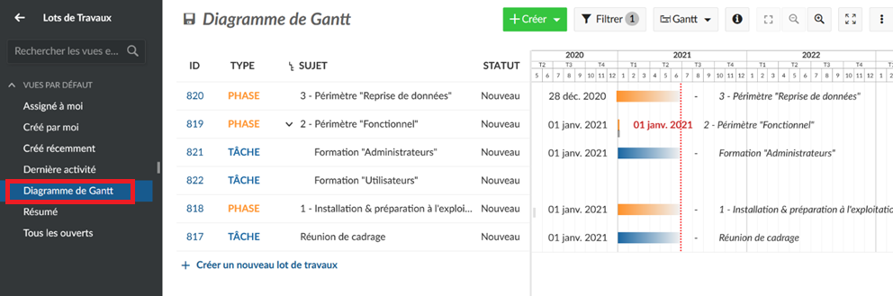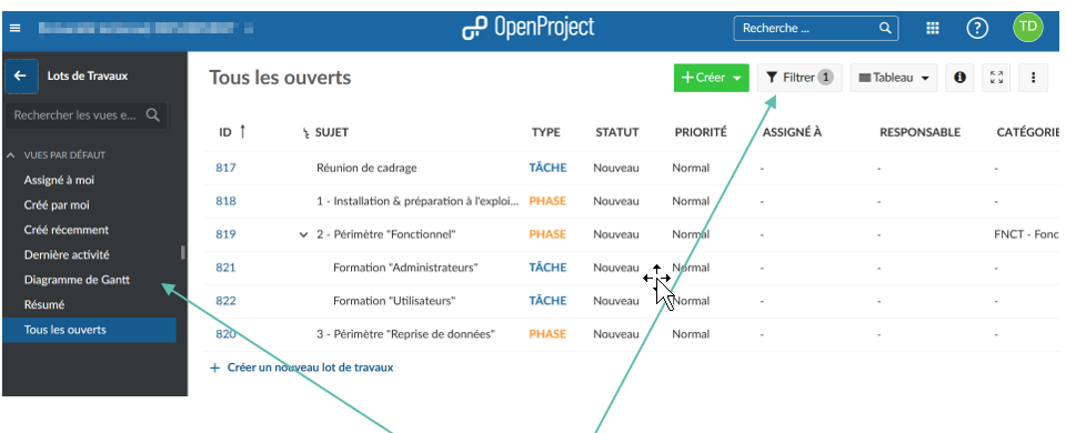 Les différentes vues disponibles vous permettent de visualiser uniquement certaines demandes. L’utilisation du filtre vous permet également de filtrer de manière spécifique sur les phases ou tâches que vous souhaitez visualiser.