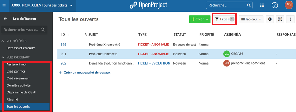 Les différentes vues disponibles vous permettent de visualiser uniquement certaines demandes. L’utilisation du filtre vous permet également de filtrer de manière spécifique sur les demandes que vous souhaitez visualiser