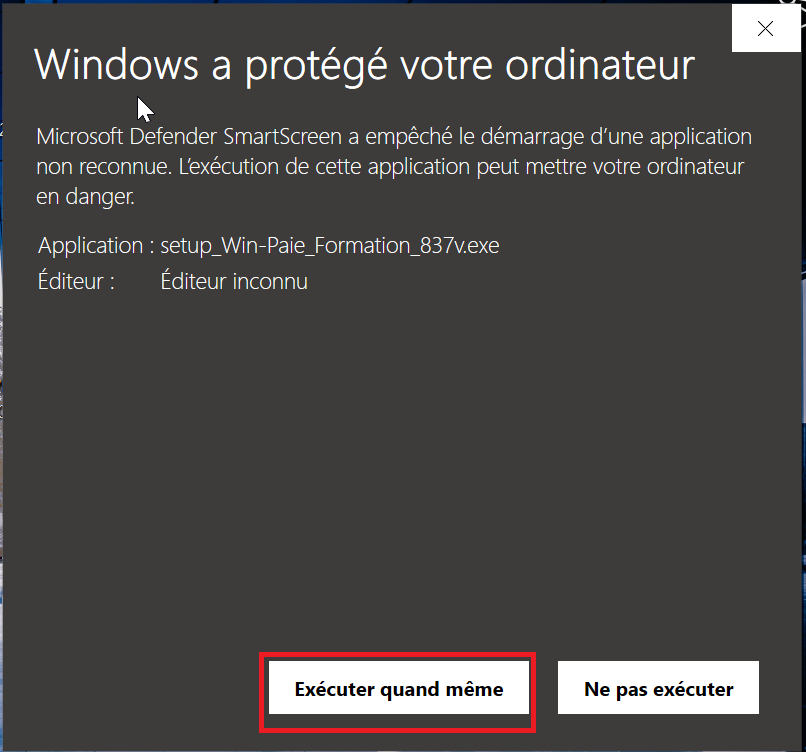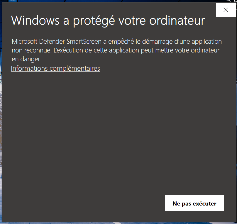 3. Il faudra "forcer" l'exécution en cliquant sur "Informations complémentaires" et cliquer sur exécuter quand même :