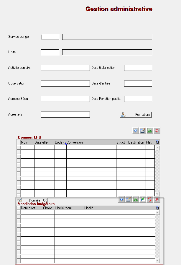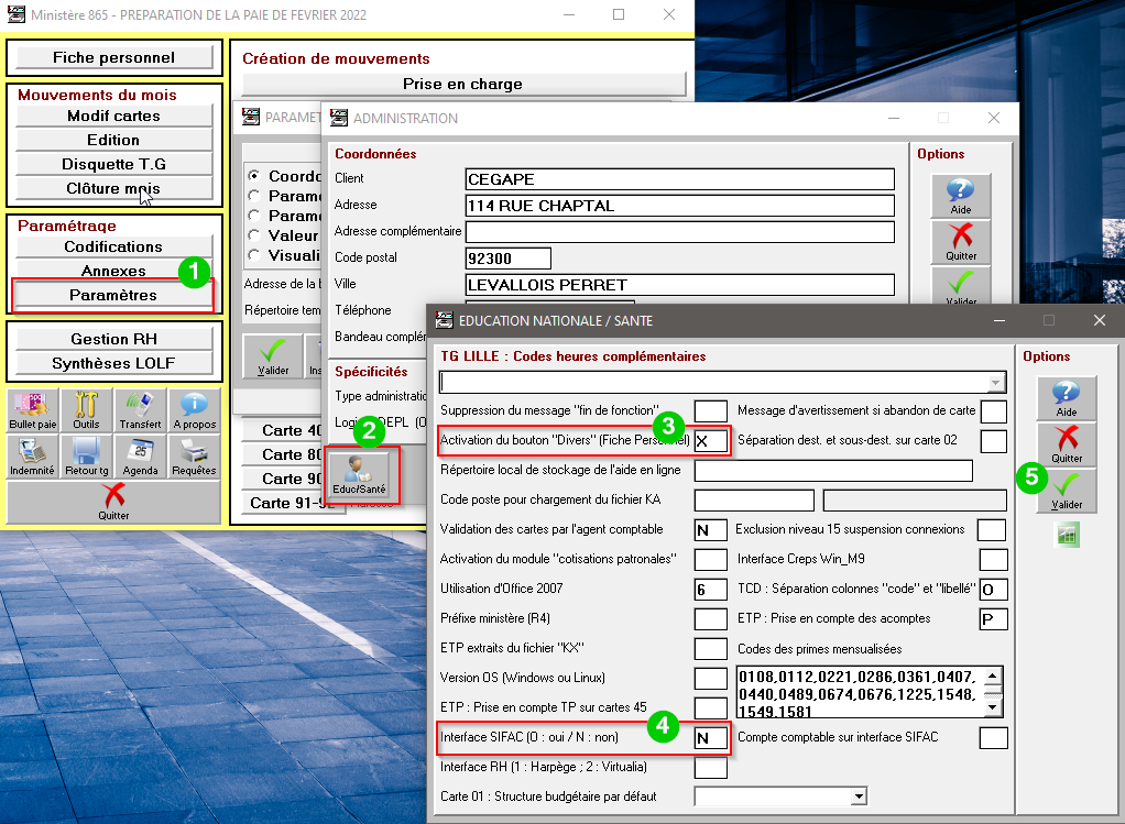 Pour activer ce module, allez dans le menu « Paramètres » > « Coordonnées administration » > « Educ/santé » et saisissez la lettre « X » dans la zone activation du bouton "Divers", puis saisissez la lettre "N" dans la zone activation "Interface SIFAC" et valider.