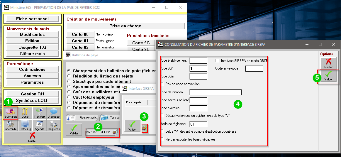 Une fois le module activé, il convient de saisir les paramètres budgétaires propres à votre établissement. Pour cela, allez dans le menu « Bullet. Paie », cliquez sur le bouton " Interface SIREPA", puis saisissez les données budgétaires et valider: