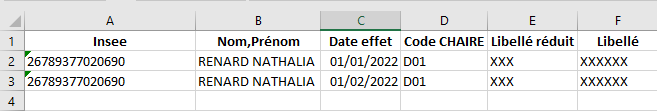 Dans le tableau ci-dessous, les deux premières colonnes « INSEE » et « Nom, Prénom » sont issues d’une requête avec un export vers Excel.