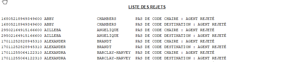 Au moment de créer le fichier d’interface SIREPA, un outil de contrôle s’assurera que les sommes déversées sont parfaitement en adéquation avec celles du journal de paie. En cas d’anomalie, l’agent concerné sera rejeté (le déversement sera donc juste pour le reste de la population) et ajouté à une liste de rejets :