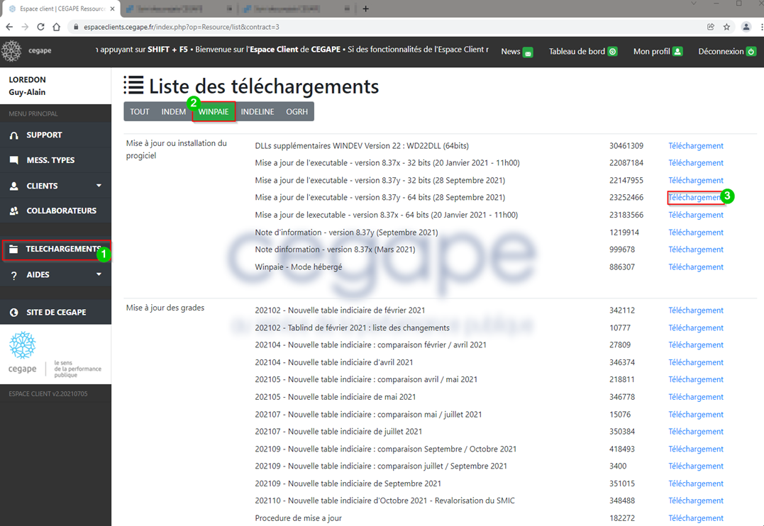 Dans un premier temps, il faut se connecter à l’Espace Client, cliquer sur l’onglet « Téléchargement » (1), cliquer sur l’onglet « WINPAIE » (2) et chercher la dernière mise à jour disponible de WINPAIE (3)