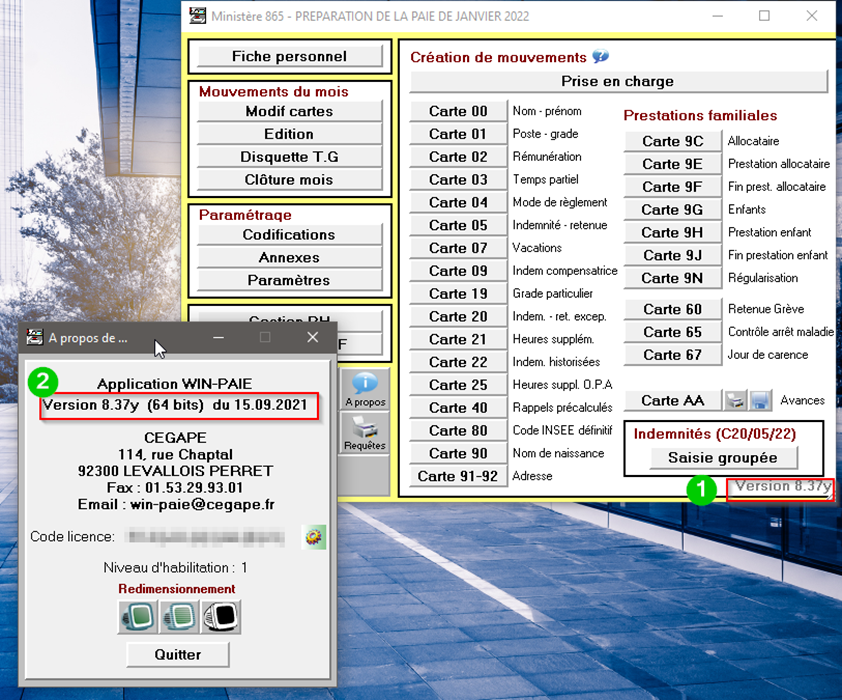 Pour finir, vous pouvez relancer WINPAIE. La nouvelle version apparaît sur le point (1) et en cliquant sur l’onglet « à propos » (2)